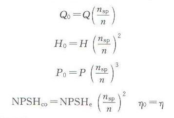 在于規(guī)定轉(zhuǎn)速不符的轉(zhuǎn)速下得到所有數(shù)據(jù)均應(yīng)換算為以規(guī)定轉(zhuǎn)速為基準的數(shù)據(jù)。流量Q 、揚程H、軸功率P、